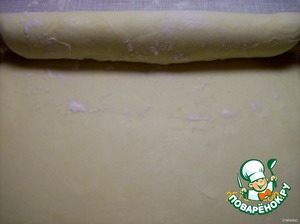 Раскатать одну часть по размеру противня, присыпать мукой, накрутить на скалку, перенести на застеленный пергаментом противень -