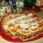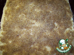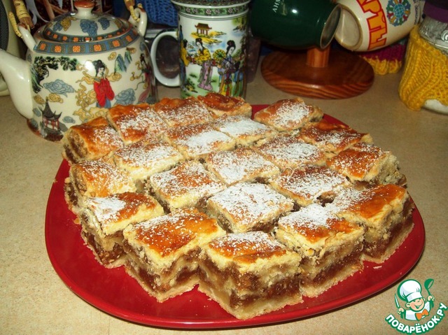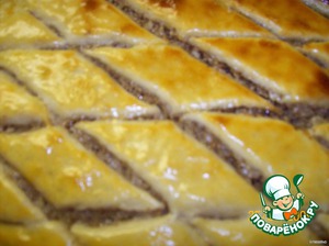 Накрыть вторым слоем теста, на него вторую половину начинку, сверху слой теста.