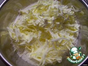 В миску насыпать 3 ст. муки, натереть сверху 300 г маргарина