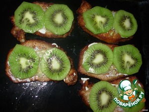 На противень, смазанный растительным маслом, выложить свинину, полить немного майонезом, выложить жареный лук, сверху кусочки киви.