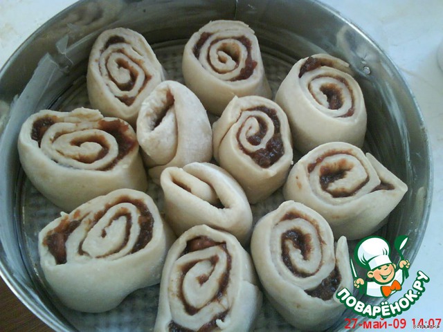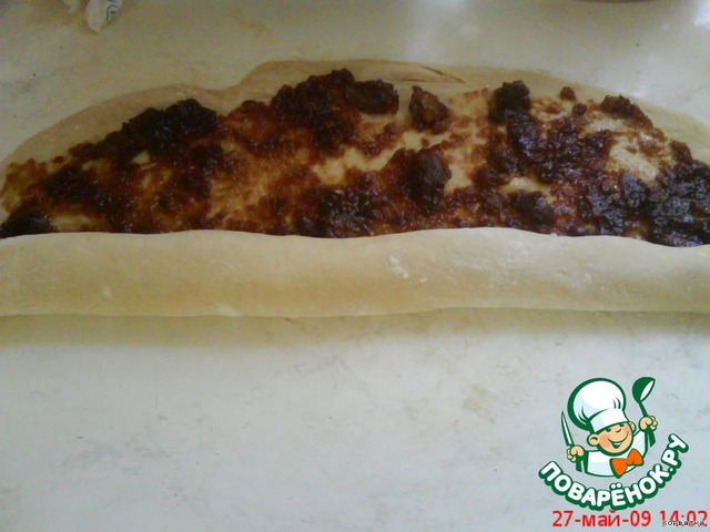 Тесто еще раз вымесить. Затем раскатать в большой прямоугольник. Сверху выложить джем (я положила яблочный джем, у нас он самый густой.) Желательно, чтобы меньше жидкости было в джеме.