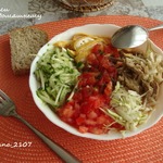 3 салат: Половину обжаренного лука смешиваем с тонко нашинкованными огурцом и капустой (капусту как следует помять), добавить помидор, янеми и хорошо заправить красным горьким перцем (опять-таки по усмотрению, если не любите остроту, то немного перца).