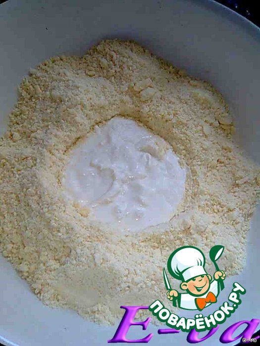 Для начала маргарин натереть на крупной тёрке и смешать с мукой. Смешивать лучше руками, так быстрее и удобнее. Все смешать в мелкую крошку. Собрать горкой, сделать там углубление и добавить всю сметану. Замесить тесто. Оно должно получиться мягким.