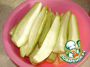 Кабачки помыть, удалить носики и попки и нарезать вдоль на 4 части,