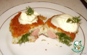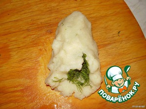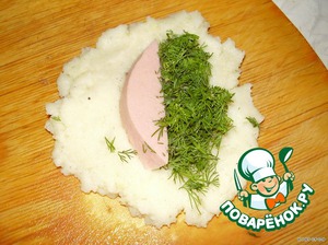 Лучше делать все в руках: руки намочить, из небольшого количества пюре сделать лепешку, на середину положить кусочек колбаски и укроп