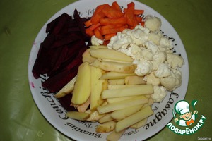 В кипящую воду опускаем: нарезанные соломкой свеклу (доводим до кипения), морковь (снова до кипения), картофель (до кипения воды), поделенную на мелкие соцветья цветную капусту.