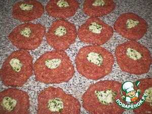 Разделить фарш на котлетки по количеству начинки. Выложить на каждую лепёшечку начинку и сформовать котлеты.