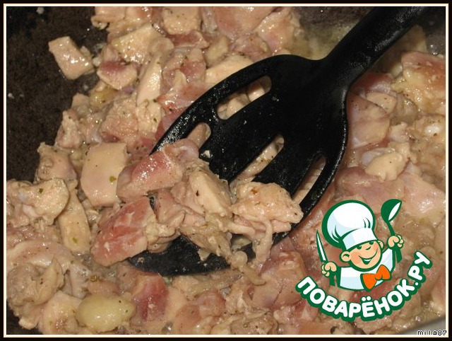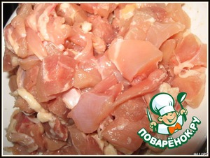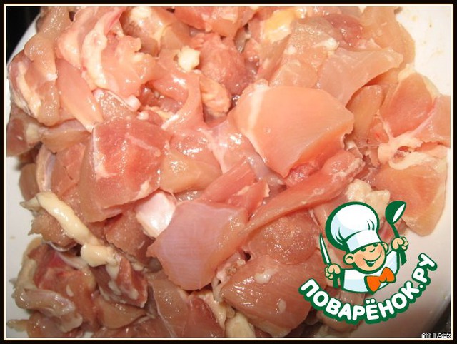 Пока поднимается тесто, режем филе кубиками размером с миндальный орешек.
