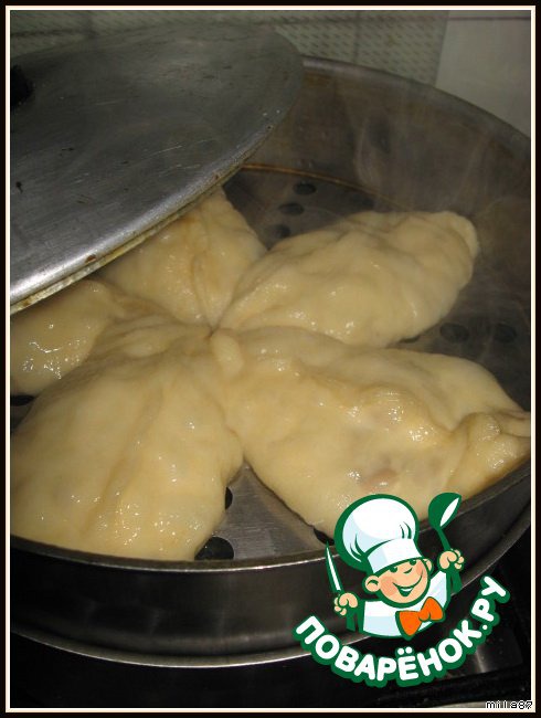 Как только начали заполнять лепешки начинкой, поставить на огонь кастрюлю от пароварки...