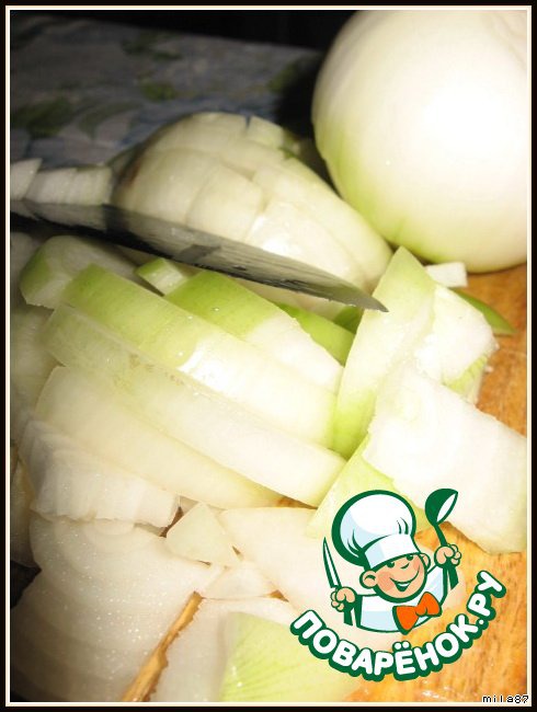 Пока мясо слегка прожаривается, режем лук четвертинками колец.