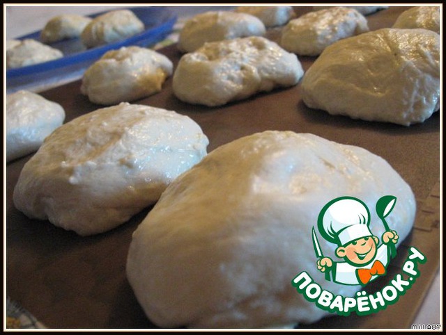 Когда тесто поднимется второй раз, тщательно вымешиваем все тесто до упругости, затем формируем шарики размером с детский кулачок и выкладываем их на смазанную поверхность подняться...
