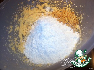 Всыпать муку с разрыхлителем и кедровые орешки.
