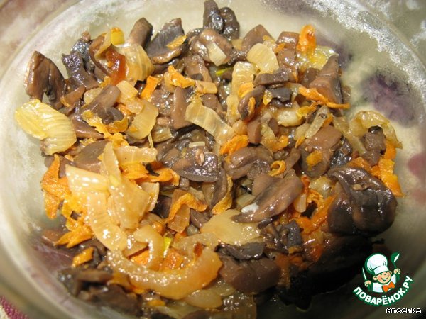 Грибы порезать пластинами, лук - кубиками, морковь натереть на крупной терке. Обжарить все до готовности на растительном масле, немного посолить.