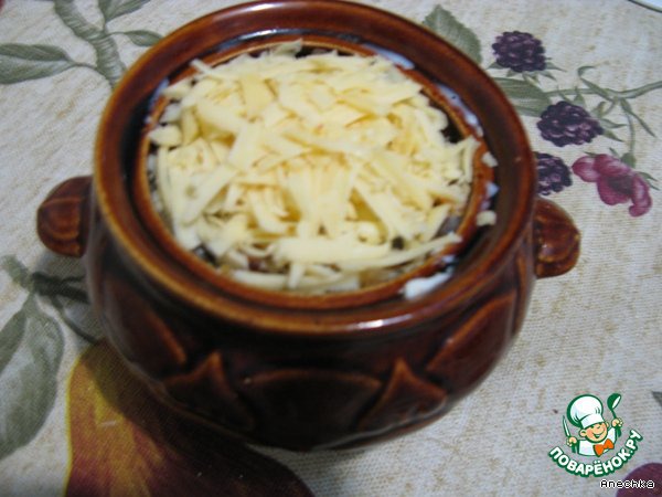 Открытый горшочек поместить в разогретую до 200 градусов духовку минут на 10-15, чтобы каша напиталась сливками, а сыр подрумянился.