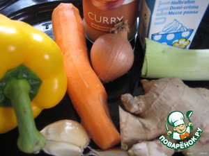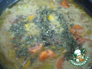добавить салатный перец и порей, посолить, поперчить, добавить "карри" и тушить с добавлением воды до готовности моркови. -