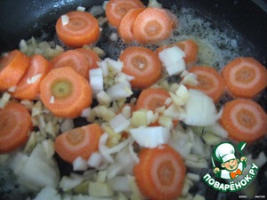 На разогретой сковороде на масле обжарить лук, чеснок, имбирь, морковь;