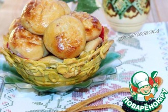 • Готовые шарики укладываем друг за дружкой на противень, застеленный бумагой для выпечки, предварительно смазав места соединения сырым яйцом.