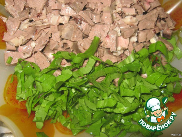 Нарезать щавель "лапшой", отварное сердце -кубиками. |