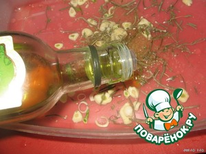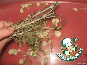 Выложить его в контейнер. Добавить розмарин и тимьян, только листочки, которые просто оборвать с веточек.