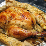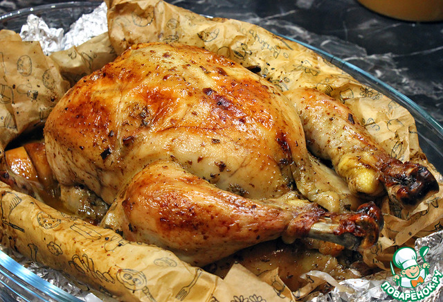Потом выложить форму фольгой так, чтобы можно было свободно накрыть курицу сверху. Выкладываем курицу, поливаем маринадом.