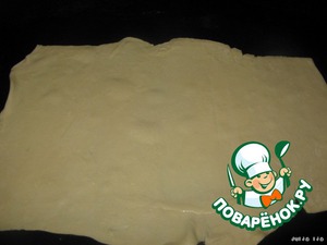 Тесто раскатать на столе (если замороженное - разморозить предварительно), толщиной ~3мм. Перенести его на, смазанный растительным маслом, противень.