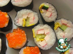 На слой пергаментной бумаги ( или специальный коврик) кладем лист нори так, чтобы его можно было свернуть потом от себя. Выкладываем на лист рис слоем в 1 см, смачивая руки в холодной воде с уксусом. Рис должен занимать 2/3 листа. Берем за край пергаментную бумагу и начинаем сворачивать ее вместе с нори в рулет. Затем аккуратно отлепляем нори и катаем тугой длинный рулетик. Острым ножом нарезаем из рулета брусочки (роллы), на каждый ролл выкладываем сверху красную икру.