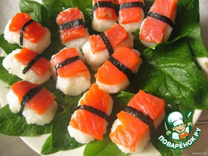 Лист нори нарезаем тонкими полосочками. Форель нарезаем прямоугольными кусочками. Из риса руками формируем брусочки (смачивая руки в воде), на каждый брусочек риса кладем кусок форели и перевязываем полосочкой нори. Делать это все нужно аккуратно (не так как я)))