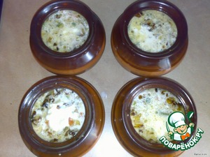 3. готовим заливку из бульона, сыров и сметаны и заливаем в горшочки