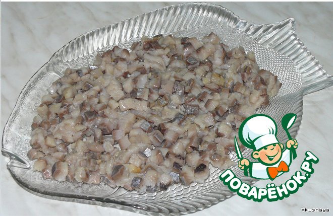 Филе сельди нарезать кубиками.