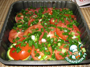 Мелко режем лук и посыпаем помидоры