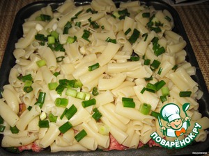 И выкладываем сверху вермишель. Еще немного лучка.