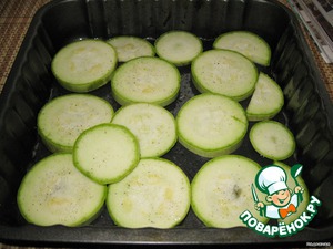 Форму смазываем растительным маслом и выкладываем на дно кабачковые кружки. Подсаливаем, перчим.