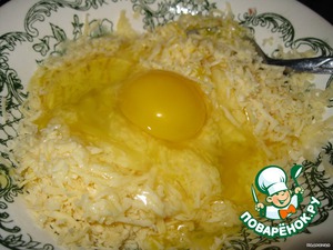 Трем сыр на мелкой терке и добавляем 3 яйца. Перемешиваем.