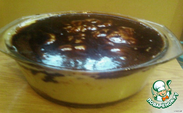 Выливаем крем сверху на пирог и в холодильник на ночь, крем должен застыть.