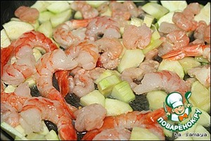 • Потом на сковородку кидаются не размороженные креветки. В идеале - только королевские. Но т.к. королевских было мало, были добавлены еще и мелкие, хотя, лучше обойтись без них - вкус слегка портят. Закрыть крышкой и немного их потушить в собственном соку и соке от цуккини.