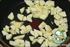 • Режем его дважды вдоль, а потом на поперек на мелкие кусочки. Слегка обжариваем на сковороде.