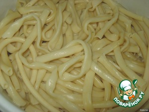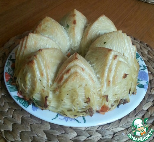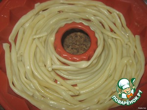 В смазанную маслом ,форму для запекания , выкладываем спагетти на дно и по краям.