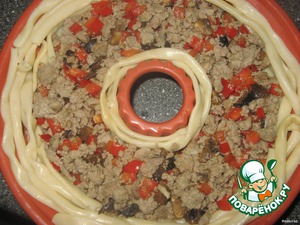 Соединить овощи с мясом, посолить, поперчить, перемешать. -
