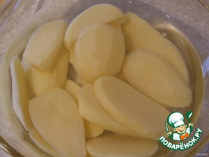 Почистить картофель и нарезать ломтиками в 5-8 мм толщиной.