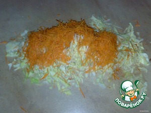 3. Режем капусту, трем на терке морковь, добавляем соль и перец и немного помять, чтобы капуста дала сок.