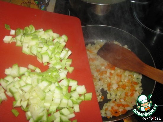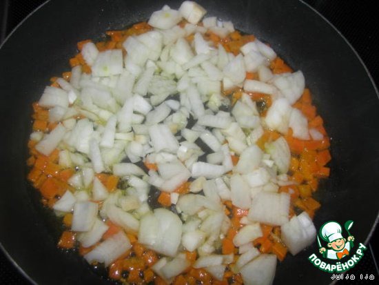 Для начинки морковь нарезаем кубиками, обжариваем на растительном масле.