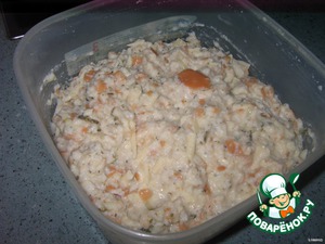 Туда же добавляем сыр, чеснок, яйца, сухой молотый орегано, манку и посолить-поперчить по вкусу.