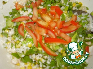 Добавляем помидор, нарезанный полосочками, перемешиваем