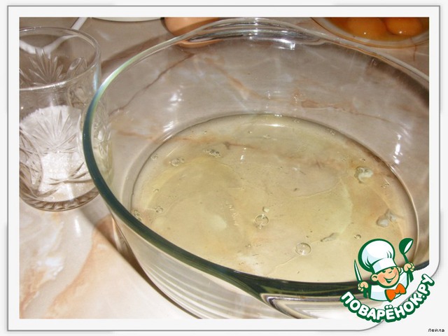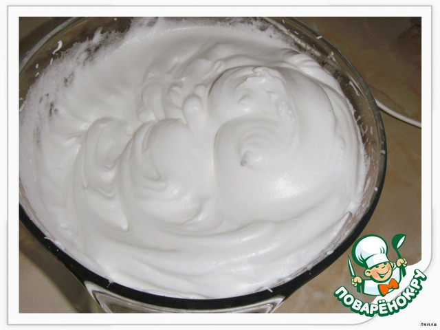 [b]Коржи. [/b] Взбить белки с 1/3 стак. сахара до устойчивых пиков.