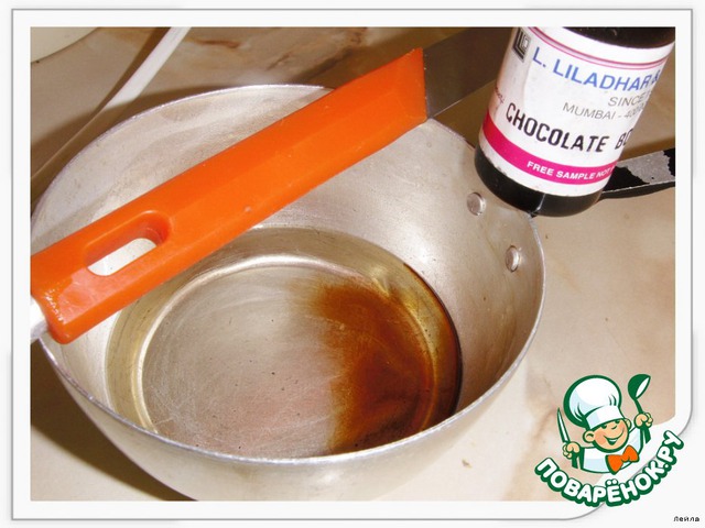 Довести до кипения воду с сахаром. Снять с огня и добавить ликёр (заменила шоколадной эссенцией) -