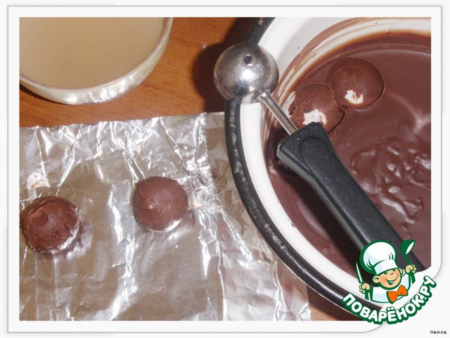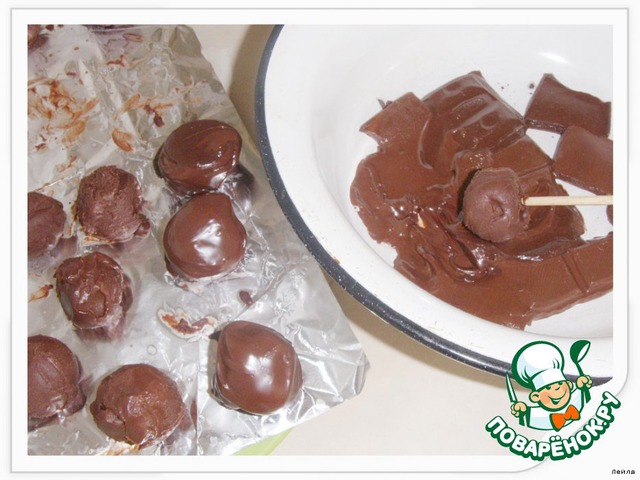 Растопить шоколад. Окунуть каждый шарик в растопленный шоколад и оставить застывать.