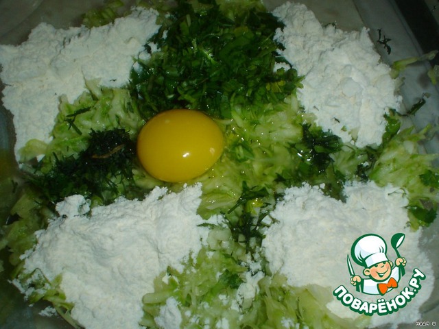 Мешаем: кабачки, сыр тертый (не очень много), специи и примерно 4 стол. ложки муки.