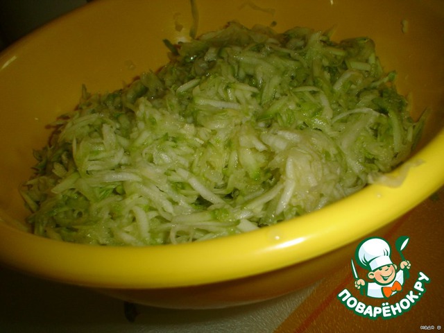 Трем на терке кабачки и также даем соку стечь, а лучше взять марлю, положить в нее кабачки и отжать хорошо сок.