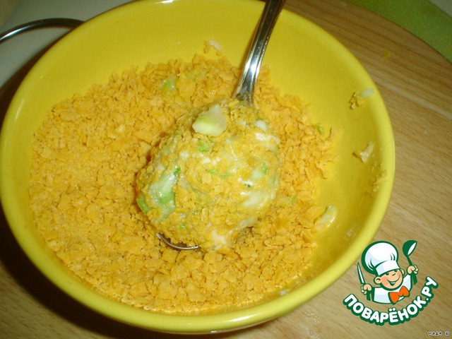 А теперь в моей излюбленной панировке из кукурузных хлопьев, за которую я очень и бесконечно благодарна Наталье-XSENIA, мы обваливаем наши оладьи.