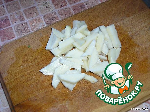 Пока делается зажарка, почистить и нарезать картофель, закинуть его в готовый бульон.